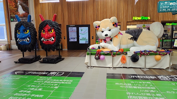 改札口前の忠犬ハチ公縫いぐるみとなまはげ