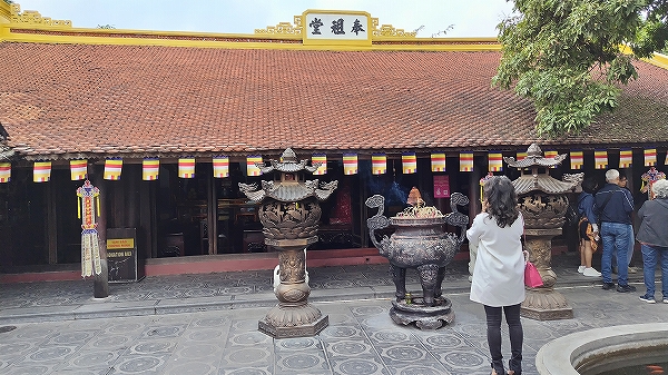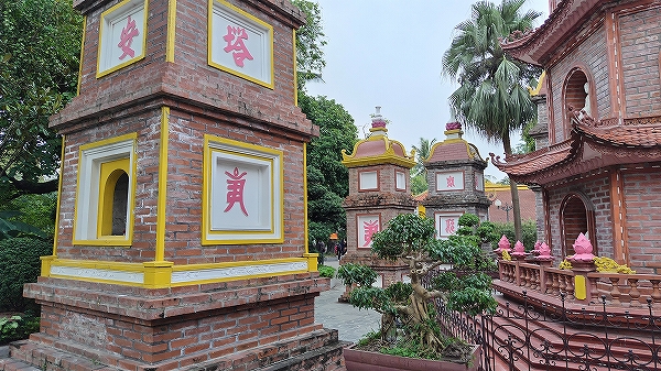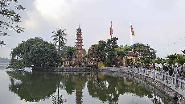 寺院は、広大な西湖(タイコ)を渡る通り沿いの小さな島の中ににあります。